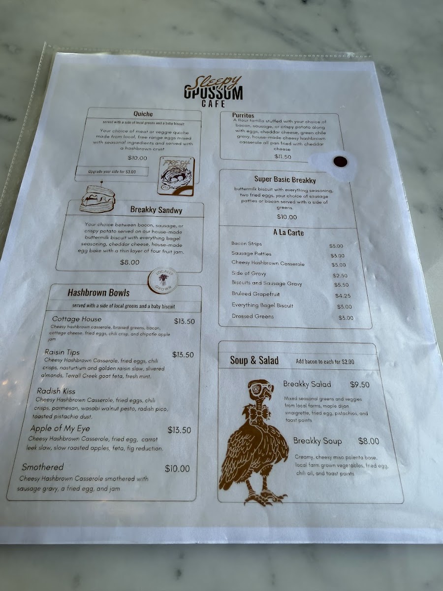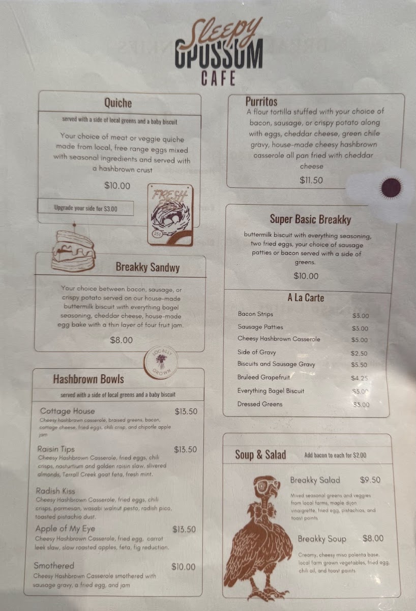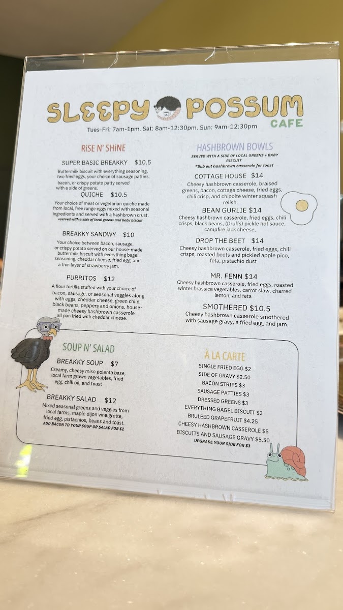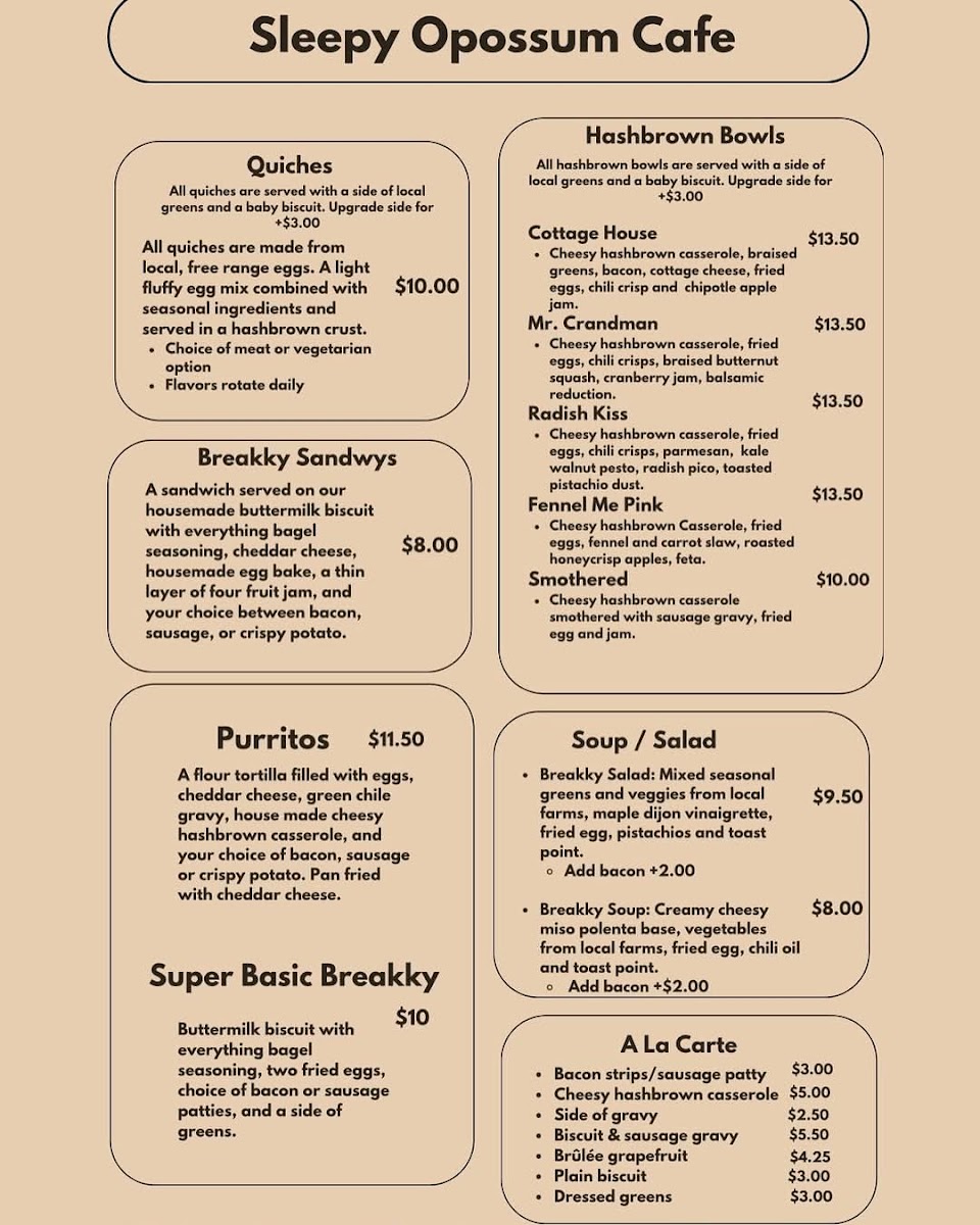 Overall, Sleepy Opossum Cafe’s menu is well-rounded, offering something for everyone-from rich and savory options to light, refreshing meals and creative drinks. Whether you're after a relaxing breakfast, a hearty lunch, or a satisfying cup of coffee, you'll find it here.