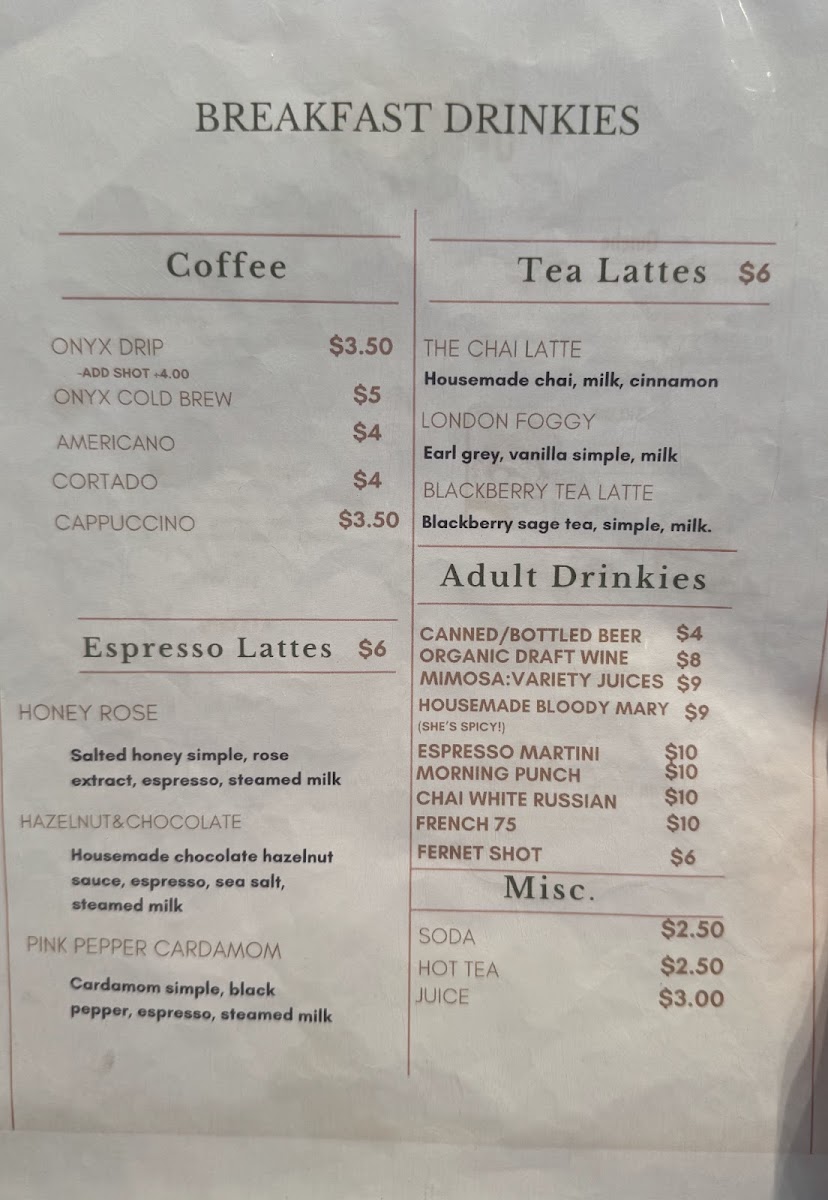 For those who want to pair their meal with a refreshing drink, Sleepy Opossum offers a variety of coffee and tea options. Coffee lovers will appreciate their Onyx Drip and Onyx Cold Brew, or opt for an Americano or Cappuccino for a classic fix. Tea drinkers can enjoy unique lattes like the Chai Latte, London Foggy, or a fruity Blackberry Tea Latte. Espresso aficionados will find comfort in the Honey Rose and Hazelnut & Chocolate lattes, or something a little more exotic, like the Pink Pepper Cardamom.